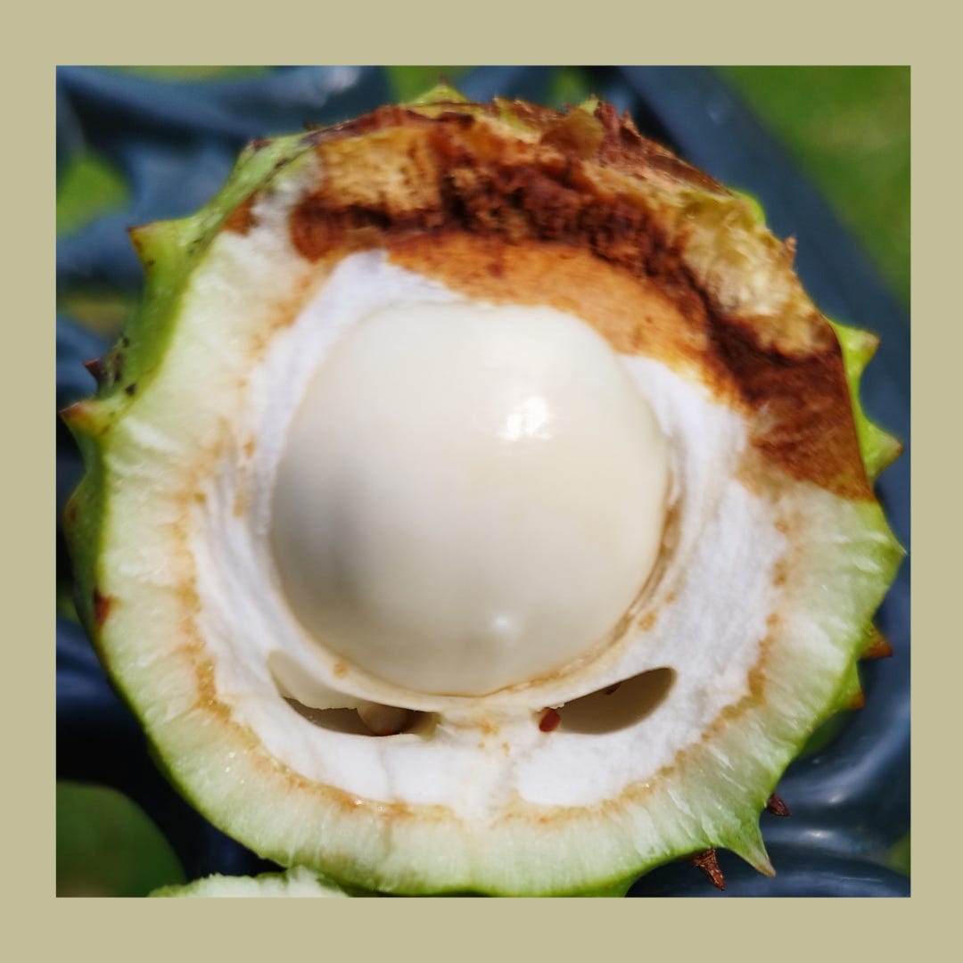 I heard your arrival. There was a rustle, a snap, a tear, a swipe and a soft thud. I looked towards the commotion to see you roll in my direction. Thank goodness I wasnāt directly underneath you. Your spikes are fully formed, yellow and as sharp as sharks teeth. Your lime green outer coating hints at your early demise, usually a deeper hue, mature and ready to spill your contents. Your fissures are tightly shut, not exposing the treasures within. I guess that, given the time of year, your seeds will be white and barely formed - Iāll have a peek later. And so, as you lay on the emerald grass, looking up at the hangers on, you contemplate what might have been? If only you had stayed put.
