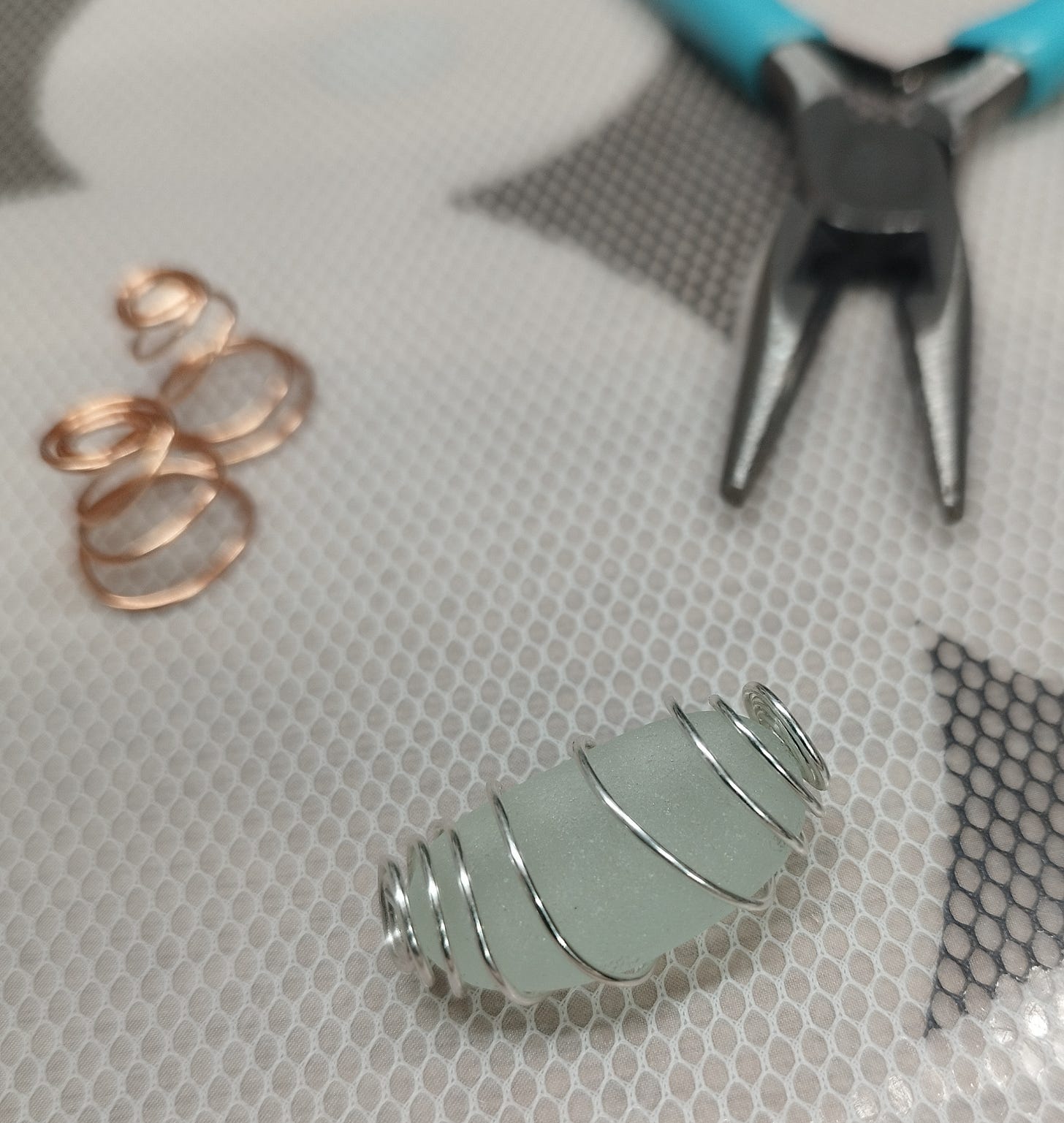 I took along my sea glass and set to work creating a spiral out of coloured wire. The end of the spirals were positioned initially at either end of the sea glass and carefully, with some maneuvering, managed to encase the glass, transforming it into a nurtured jewel. It was most inspiring!
